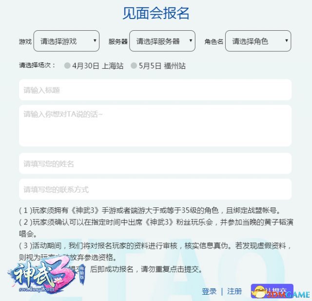 即日起,登录《神武3》玩乐会专题,留下你想对韬韬说的话,根据留言内容,在每场演唱会报名玩家中筛选出50位幸运儿,来到《神武3》玩乐会,并于当天亲临黄子韬2108 IS GOOD巡回演唱会现场,开启一场《神武3》三界少侠与首席弟子的线下音乐狂欢。目前,上海站、福州站报名活动已经火爆开启,其他站点的报名活动也将在演唱会前15天开放。心动的少侠们,赶快行动起来吧!