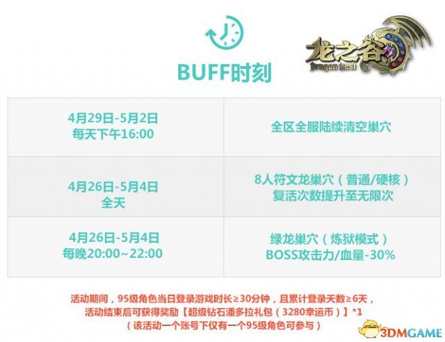 绿龙巢穴的炼狱难度可以说是《龙之谷》目前难度最高的一个回归巢穴,无论是血量还是攻击力,对不熟悉BOSS技能、没有充裕练习时间的绝大部分谷迷来说,可以称之为无法逾越的至难关。而在4月26日至5月4日晚20:00~22:00期间,炼狱绿龙巢穴BOSS攻击力和血量将减少30%,有志于攻克绿龙难关的谷迷们,绝对要把握机会!霸龙S甚至L级可升级的饰品,在前方等着你们!除此之外,8人符文龙巢穴可复活上限提升至无限次,巢穴次数多次重置,更是助力肝到飞起!