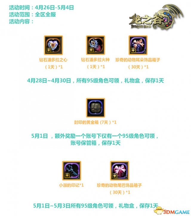 4月28日至4月30日,满级角色可每日领取钻石潘多拉之心、钻石潘多拉火种、动物耳朵饰品箱,迎接小惊喜。5月1日当天,角色还可通过账号特殊保管箱领取封印的黄金箱1个,金币滚滚滚进腰包。5月1日至5月3日,满级角色除可领取动物尾巴饰品箱外,还可以获得小淑的印记。让小淑箱子,为你在五一假期创造奇迹吧!活动期间,满级角色每日在线30分钟并达到指定天数,还可以在活动结束后获赠价值3280幸运币的超级钻石潘多拉礼包哦!