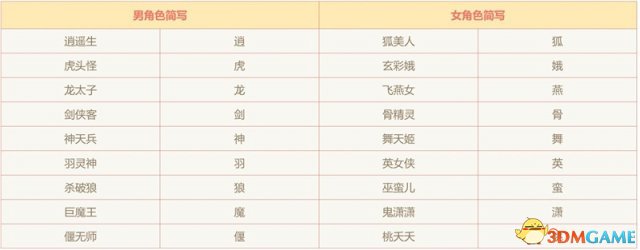 角色简称如下: