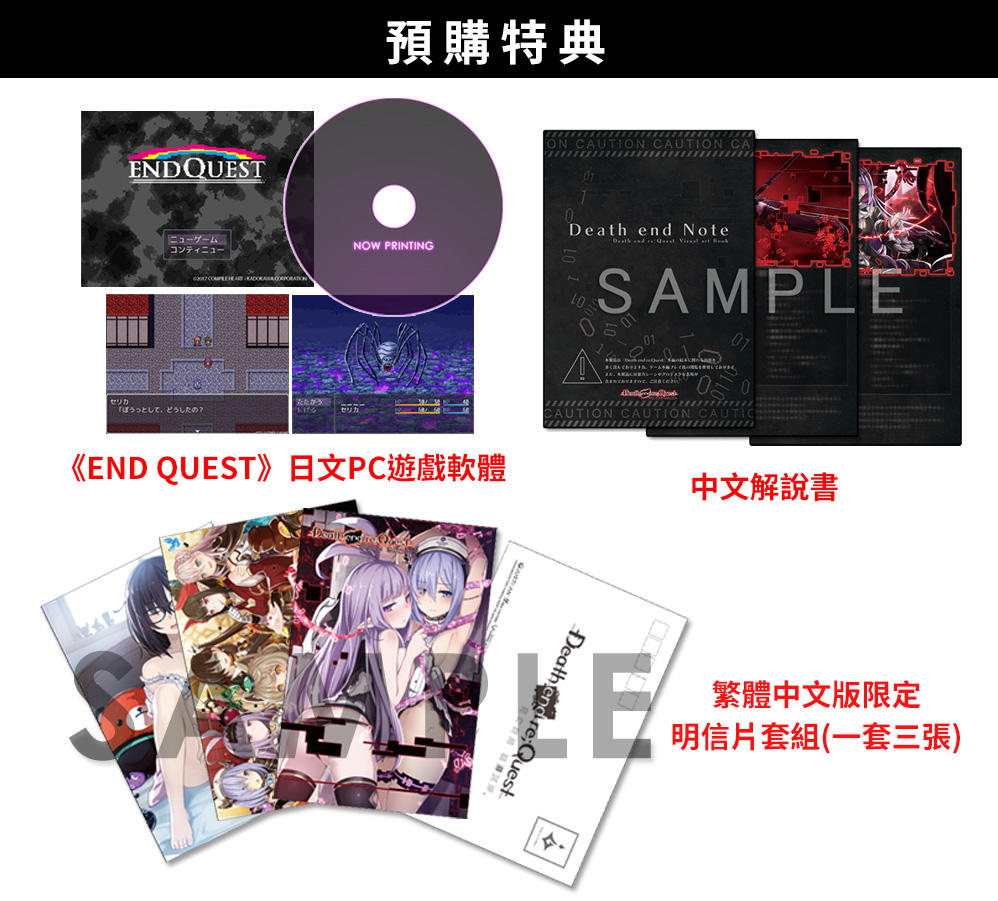 《死亡终局:轮回试炼》PS4繁体中文版标准版订价348元人民币,预购特典包含《END QUEST》特典PC游戏、中文说明书、限定明信片套组。