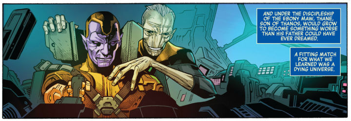 灭霸和他其余的手下在2015年的联动漫画《秘密战争(Secret Wars)》中也有不少戏份,甚至还帮助减缓了漫威多元宇宙的毁灭。在这段时期内,灭霸和黑天鹅(Black Swan)、暴君使者(Terrax)以及马克西姆斯(Maximus)等经典反派形成了“奇妙”的结盟。