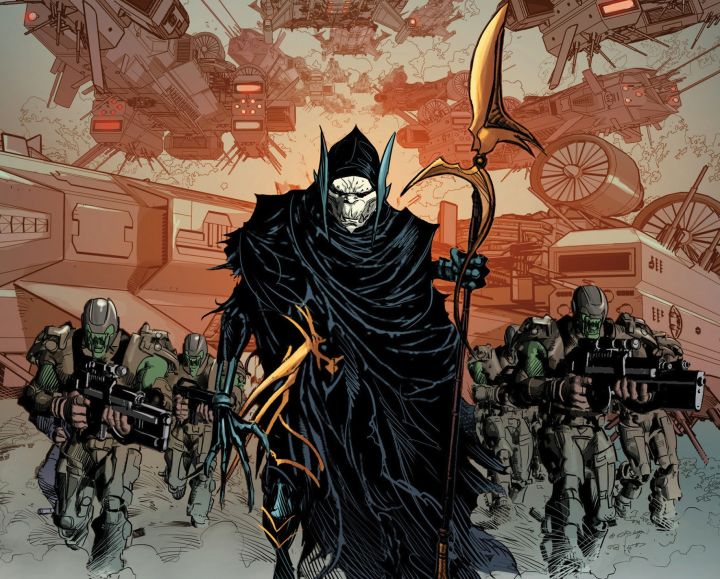 亡刃将军(Corvus Glaive)-最厉害的灭霸手下,他有着超凡的力量和速度,手中的利刃可以斩穿一切。只要他的兵器尚在,亡刃将军就是不死之身。