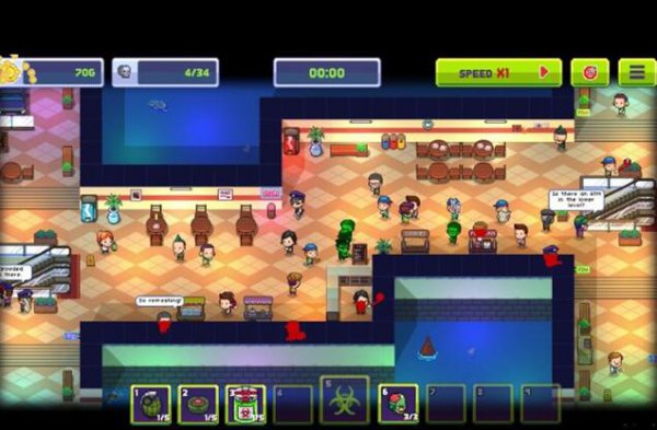 本作主要采用的是刷图闯关的游戏机制,每一关玩家扮演的僵尸需要将场景中的人类全部感染才能完美获胜。但是地图的选择是随机的,你可以随意选择地图上的一片区域进行感染,最重要的一点是你应该及时摧毁正在研发解药的地区。