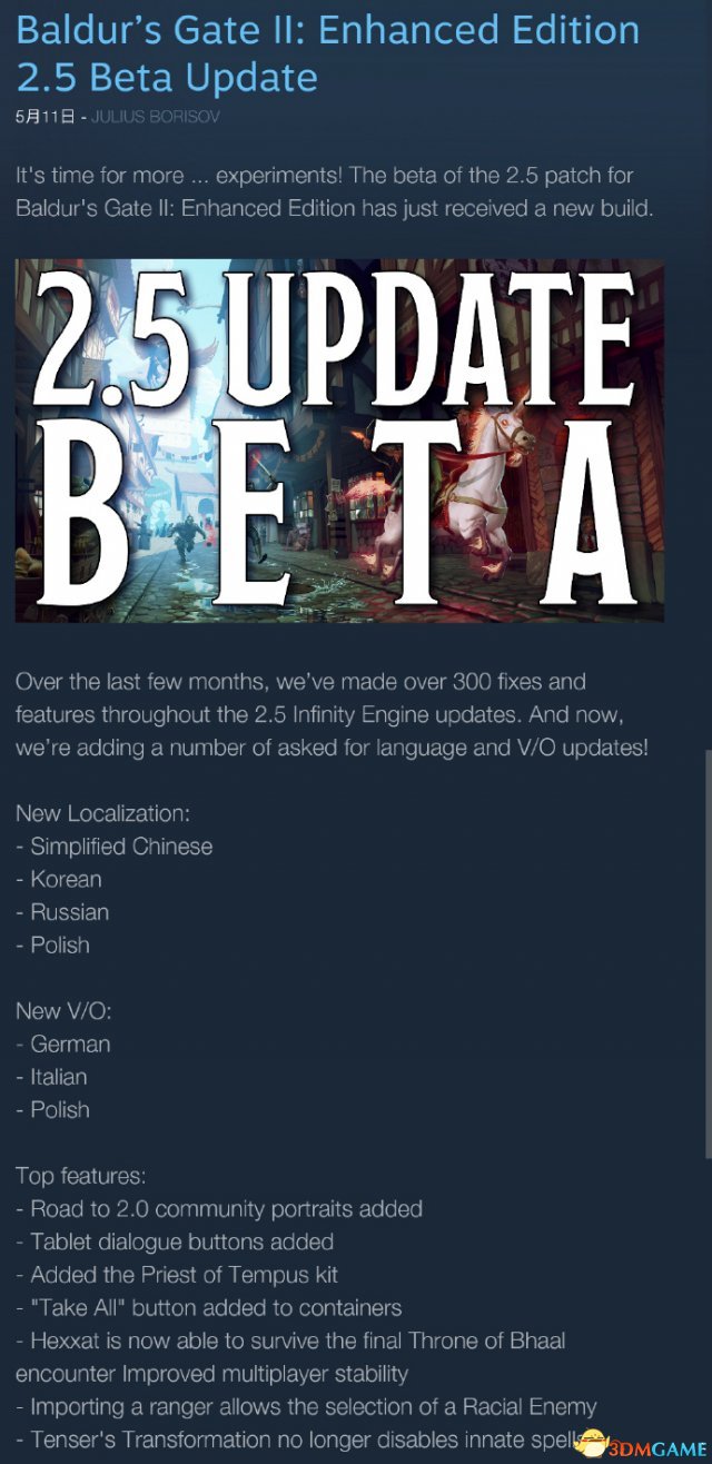 昨日开发团队在游戏的Steam主页上宣布《博德之门2:增强版》2.5 Beta迎来了一个新的版本。新版本已经加入了简中支持,玩家现在可以开启游戏的BETA测试选项进行抢先体验。