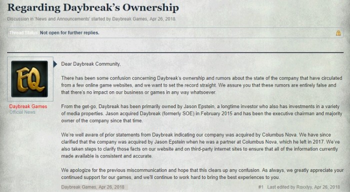 黎明工作室否认3年前被收购的公告,是在其MMO游戏《无尽的任务》官网论坛,以Daybreak Games的官方账号身份发布的,真实性毋庸置疑。