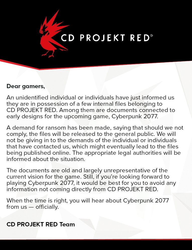 时间到了2017年6月,CDPR放出了一封公开信,他们表示有人声称自己拿到了《赛博朋克2077》的内部文件,并以此相要挟索要赎金。不过CDPR在信中声明,他们绝对不会妥协,并且向玩家保证所谓的内部文件只是一些过时的内容,如果文件流出也不代表游戏当前的内容情况。