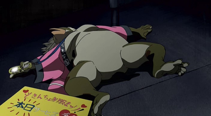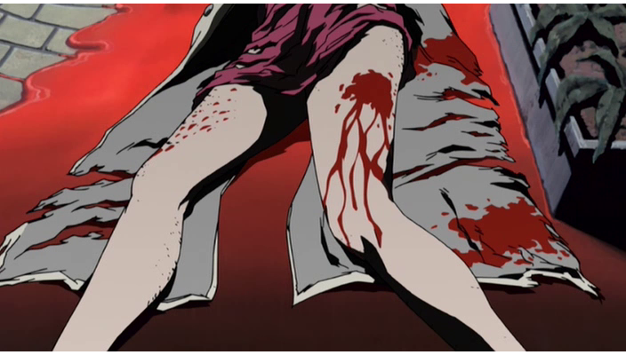 当音乐所带来的冲突过去后,关注点就会从听觉转移到视觉。这部动画的色彩真的很灰暗,与《吸血鬼猎人D(Vampire Hunter D: Bloodlust)》相比有过之而无不及,不过搭配有些恐怖又黑暗的剧情也算是相得益彰。动画中的灰暗色彩营造出一种颓败氛围,即使画面中是充满现代气息的城市,也挡不住那种沮丧的感觉。然而有一种色彩与灰暗所营造的颓败显得格格不入,每当这种色彩出现的时候,它就那样突兀的呈现在你眼前,让人移不开目光,而这种颜色就是血红色。