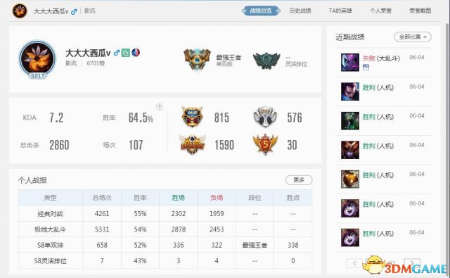 这位名叫“大大大西瓜v”的玩家在国服的影流服务器,可以说是彻彻底底的肝帝,战绩显示他几乎是全天24小时都在游戏中,且对局超过一半都是大乱斗或者人机。如此高的游戏频率显然光靠一个人是不够的,所以大部分玩家猜测有不止一个人在为账号练级,才能够在这么短的时间内达到如此高的等级。