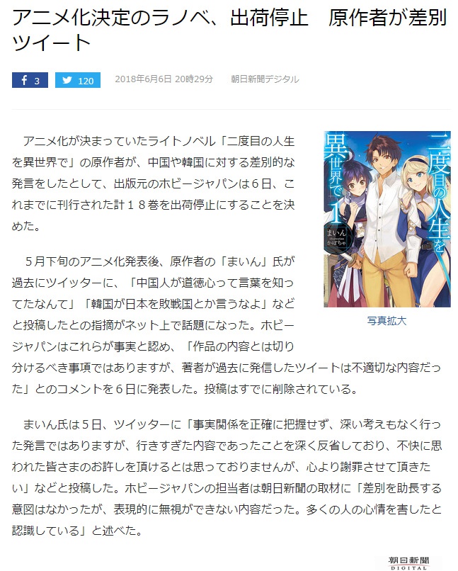 日本轻小说作品《在异世界开拓第二人生(二度目の人生を異世界で)》是以一名二战期间侵华日军士兵为“主角”,讲述其在转世到“异世界”后成为“人生赢家”并俘获众多美女芳心的故事。小说情节包含多处美化侵华战争,侮辱中国等内容,小说作者更是在个人社交媒体上发表辱华言论。