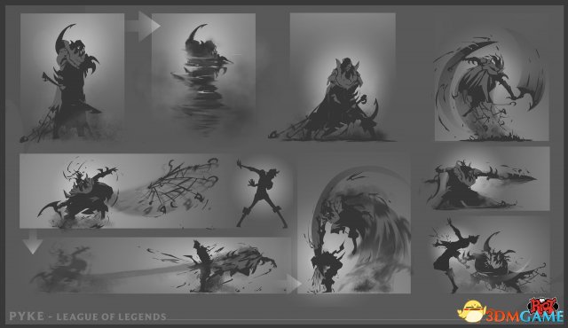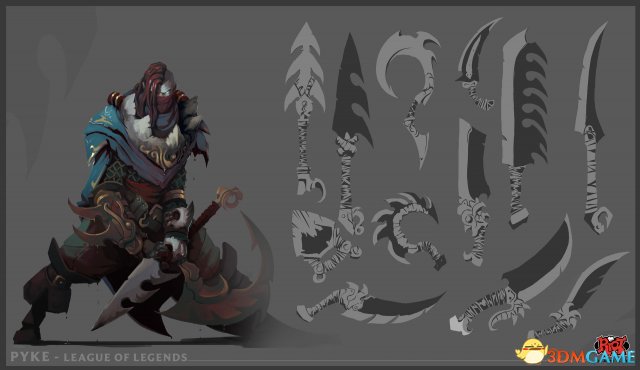 Riot 3D设计师Bourykina今天分享了《英雄联盟》新英雄血港鬼影派克的超帅初期原画,这些原画是由Riot概念画师Skeeziks绘制。从图片来看,早期的派克看起来比现在的更帅气,那时的派克还有头发,武器除了鱼叉,还有一把弯刀,服装也很华丽。
