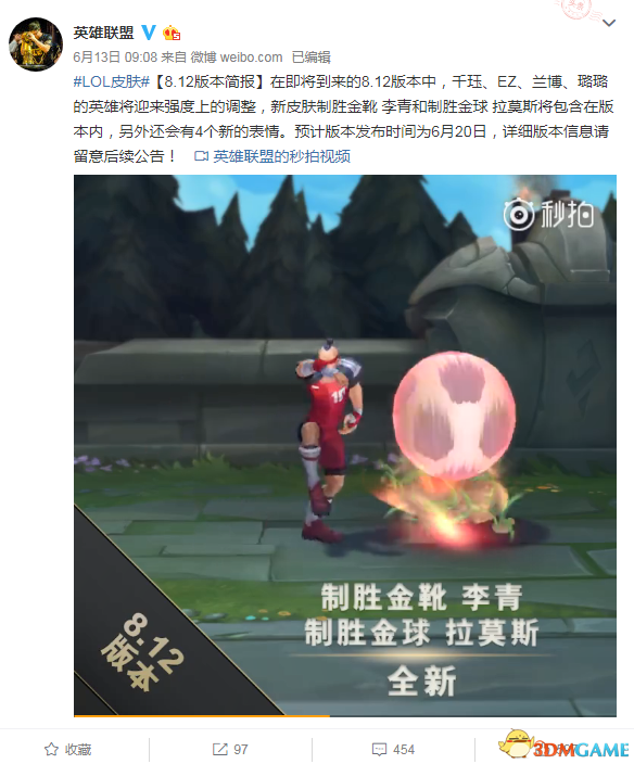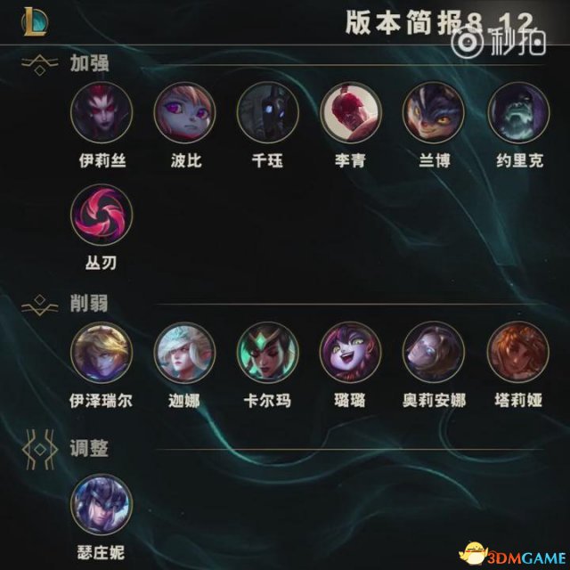 《英雄联盟》官博今天发布了8.12版本简报,EZ,迦娜,卡尔玛,璐璐,发条,塔利娅被削弱,伊莉丝,波比,千珏,李青,兰博,约里克和丛刃获得加强,猪妹进行调整,随着世界杯的到来,盲僧和龙龟迎来制胜进球皮肤。
