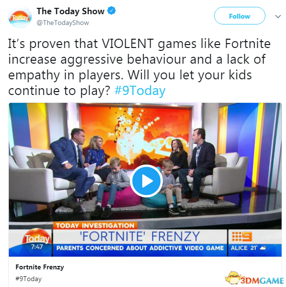 澳大利亚晨间节目“今日秀(The Today Show)”日前报道了《堡垒之夜》的消息,今日秀在节目中探讨了“堡垒之夜”狂暴话题,节目邀请了心理学家Sandy Rea,Sany称已经有130多个可靠的证据显示,像《堡垒之夜》这样的暴力游戏会让人表现得更有侵略性,缺乏同情心。