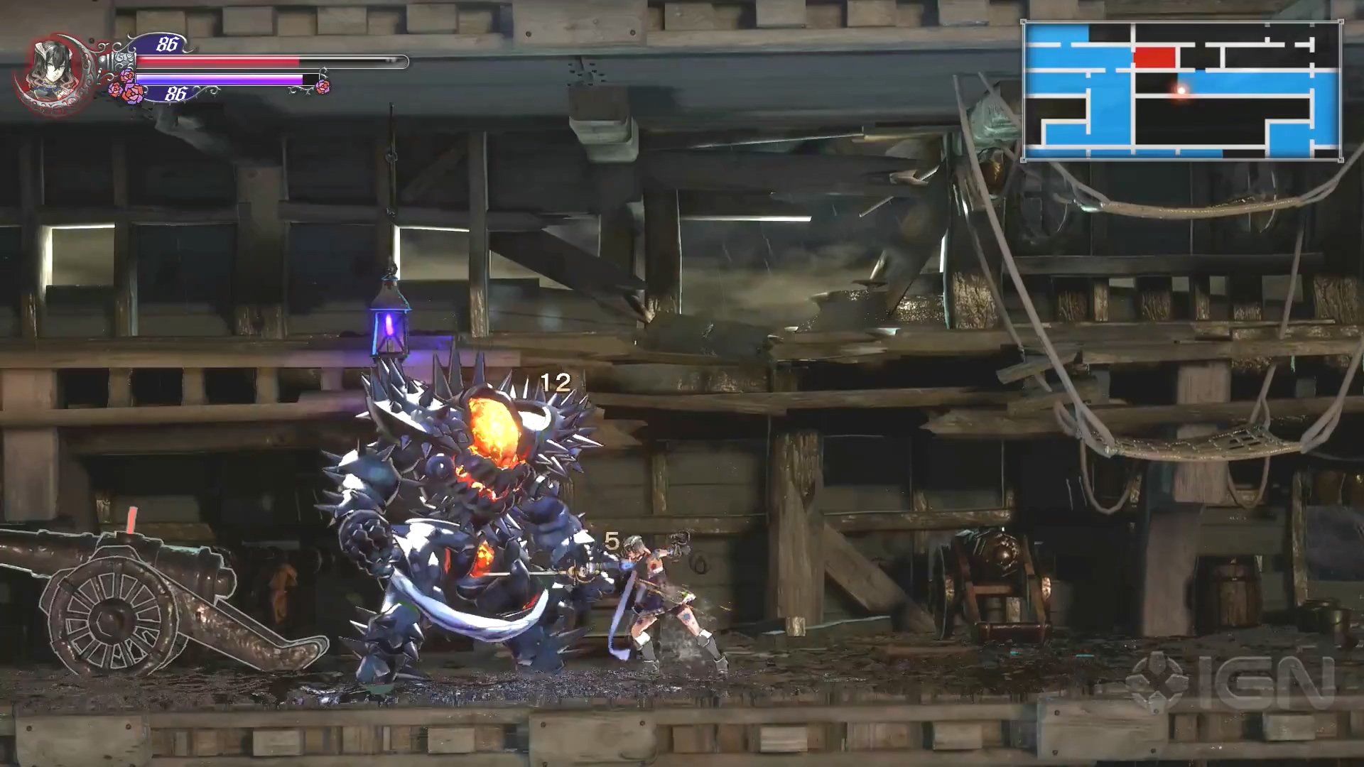 我试玩时碰到了两个boss,一个是之前试玩版最后出现的巨大海怪;还有一个拿日本刀的人形敌人,他在开始快节奏战斗前还嘲讽了玩家。我需要及时反射他的远距离攻击,还要及时在远距离火枪和近战匕首之间切换,以给敌人造成更大的伤害。最后敌人开始在画面上四处跳跃,手中的剑喷出火焰,叫嚣着要将我碎尸万段,而我则快速闪开,使用一招巨大的魔法攻击打败了他。整场战斗(我尝试了4次才赢)激烈、充满回报,而且很《恶魔城》。