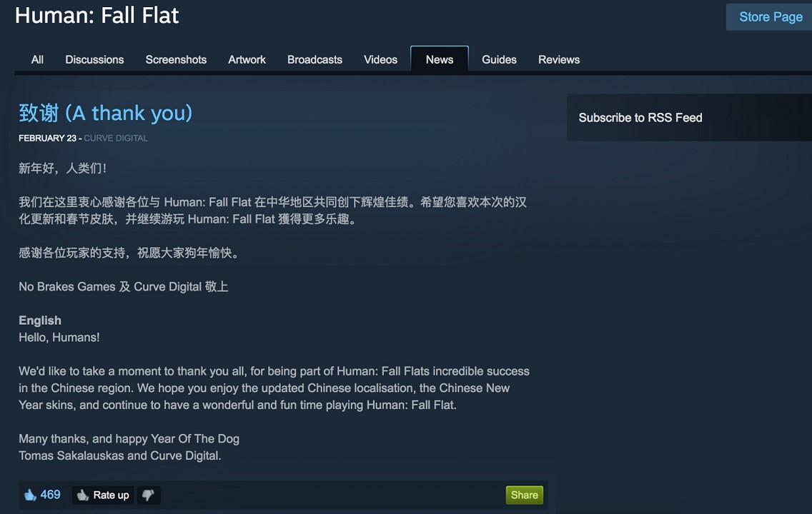 据笔者了解,《人类一败涂地》的成功与中国玩家有很大关系,2月23日,开发商还专门推出了汉化更新和春节皮肤,足见国内玩家对这款游戏的热爱程度之高,在宣布销量破400万的博客当中,发行商Curve Digital公司董事总经理Jason Perkins说,“我完全没有想到它能在亚洲这么火爆”。
