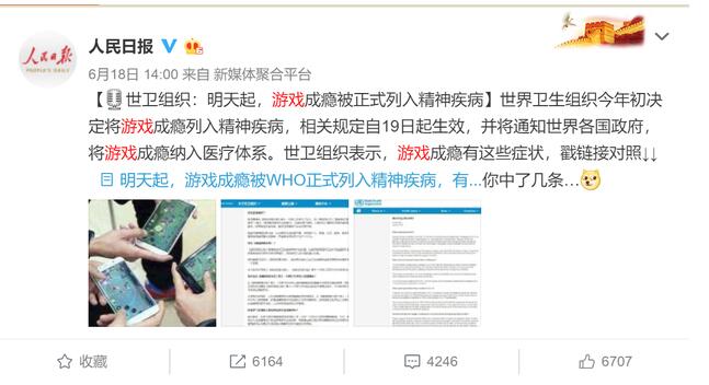 6 月 18 日,《环球时报》旗下环球网引用台湾媒体消息,称世界卫生组织 (WHO) 今年初决定将游戏成瘾列入精神疾病,‘相关规定将自 19 日起生效,WHO 将通知世界各国政府,将游戏成瘾纳入医疗体系’,相关报道一经刊发随即引发国内媒体大量转载,就连《人民日报》官方微博也以《世卫组织:明天起,游戏成瘾被正式列入精神疾病》为题进行了转发。
