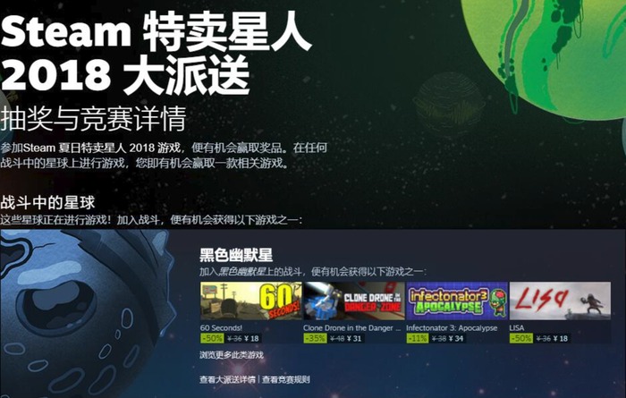 这次特卖活动的主题是“星际”,出来针对涉及该类型的游戏进行大力度折扣之外,玩家还可以在Steam页面游玩一个叫“特卖星人”的育成网页游戏,玩家可以通过这个网页游戏中的塔防小游戏来得到免费游戏。并且玩家可以通过浏览游戏列表获得集换卡牌,每天限量三张。