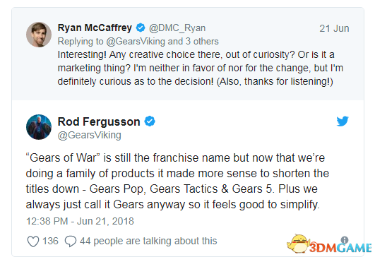 最近《战争机器5》开发商Coalition总监Rod Fergusson就在推特解释了为什么这次公布的“Gears 5”没有“of War”。在与IGN主编Ryan McCaffrey的对话中,Fergusson解释说“Gears of War”依旧是“战争机器”IP的名字,现在战争机器已经成一个系列了,缩短名字更有意义,如Gears Pop,Gears Tatics和Gears 5。此外他们也总是叫Gears,感觉简化会很舒服。