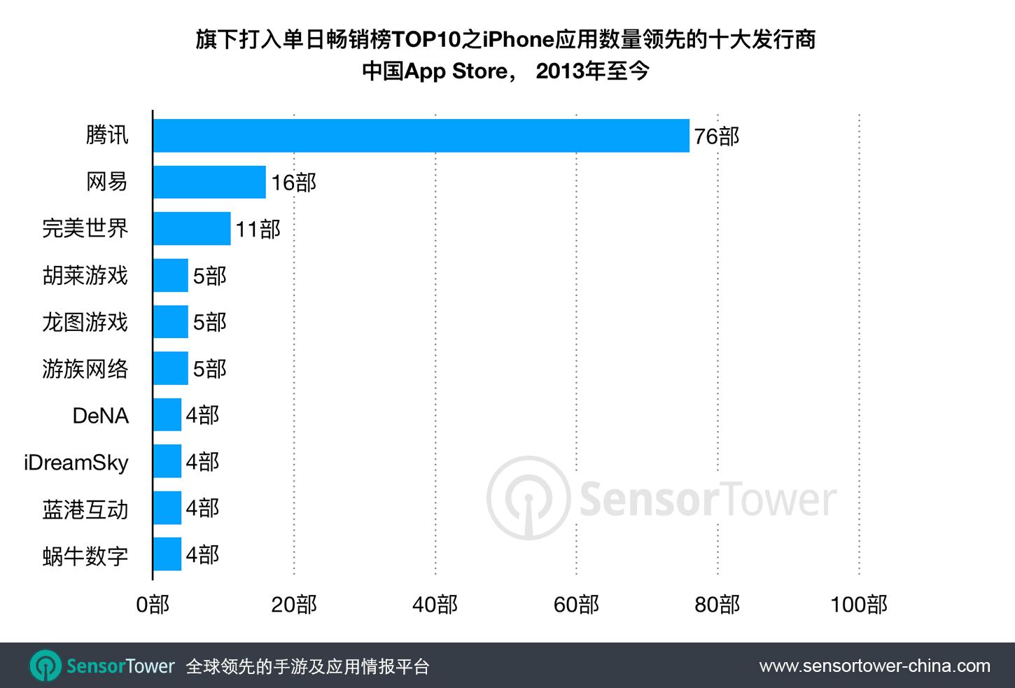 2013年初以来,腾讯旗下72款手游及4部非手游App打入App Store畅销榜前十强
