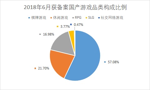 国产游戏方面游戏数量众多,但大量游戏都扎堆于相同题材,其中棋牌类数量众多,6月份获发批文的棋牌游戏甚至超过100款。6月获得文化部备案批文的212款国产游戏,具体比例是121款棋牌游戏、46款休闲游戏、36款RPG、8款SLG、1款社交网络游戏。