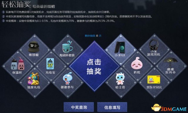 玩抽奖,我们是认真的。活动期间,玩家每天可免费获得1次抽奖机会,完成页面任务可额外领取对应抽奖机会,抽奖机会次日清零。作为给英雄们的馈赠,抽奖礼品当然寒碜不得:小米6X、京东卡、游戏耳机、游戏礼包……都等着你的到来!