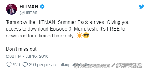 IO Interactive宣布,2016年《杀手》重启版游戏的第三章,马拉喀什任务“镀金笼子”,将于明天作为“夏季礼包”的一部分提供免费限时下载。
