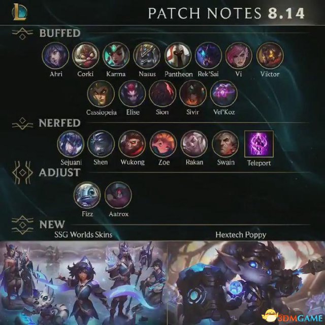 削弱英雄:猪妹,慎,猴子,佐伊,洛,斯维因。传送也获得削弱。小鱼人和亚托克斯进行调整。