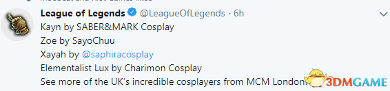 《英雄联盟》官方今天为我们分享了英国伦敦MCM漫展上游戏角色的精美Cos,看看这帮不可思议的英国玩家的精美Cosplay,从图片来看影流之镰凯隐神级cos效果拔群,后期处理后犹如本尊出场。凯隐由SABER&MARK Cos完成,除了凯隐,还有更多英雄Cos,如佐伊,霞,元素大使拉克丝等。