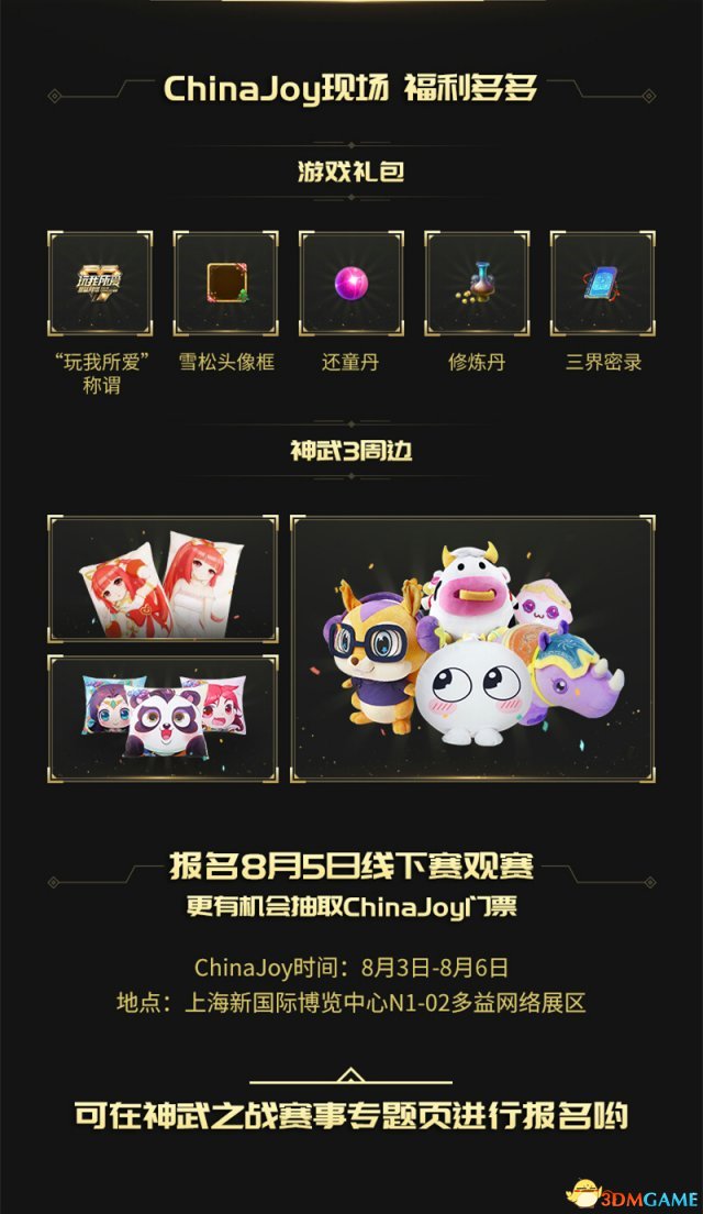 报名8月5日线下赛观战团还有机会抽取ChinaJoy门票!当天更有胜者组冠军和败者组冠军在充满神武元素的CJ现场胜利会师,为梦想为荣誉火力全开,联手为全网玩家奉上最酣畅淋漓的巅峰回合竞技盛宴。《神武3》还为观赛玩家准备了实用游戏道具、专属特殊称谓等观战好礼,更有精彩古风舞见表演、ShowGirl趣味互动、精美周边,包你不虚此行!