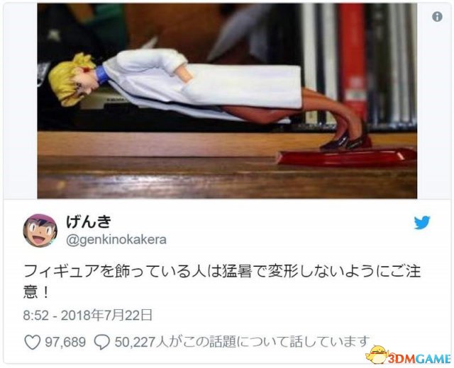 如何用最直观的形式呈现出高温天气带来的摧残?看看这些不幸的手办就知道了。原以为身处室外需要格外注意防暑,没想到连家里的手办都被高温折磨得各种变形,再加上颇为亮眼的造型,很快这张照片便在推特上疯传,引发更多网友们苦中作乐的狂欢。