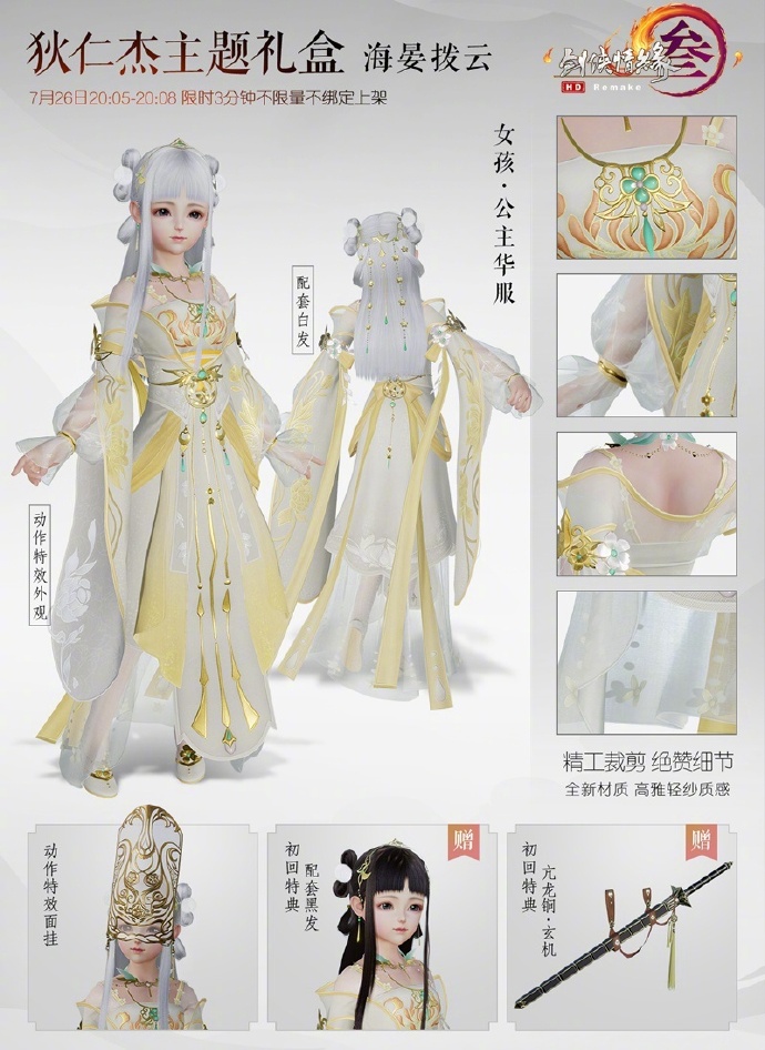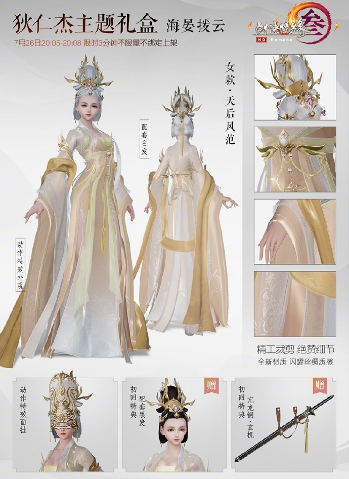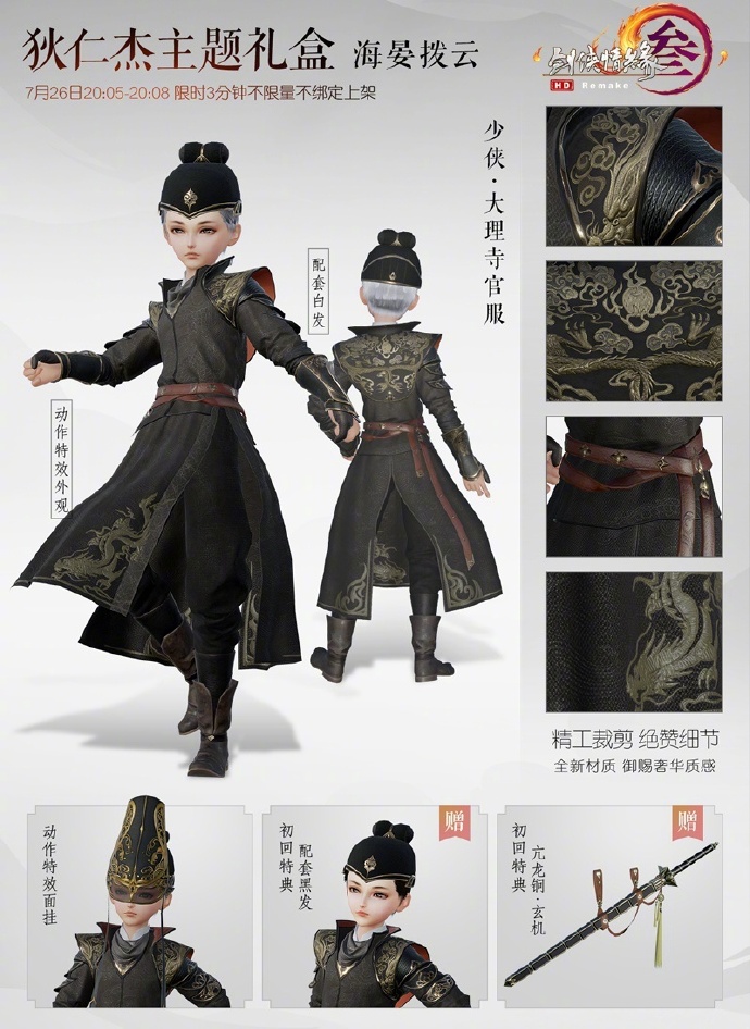 剑网3制作人于微博曝光了这套制作精良的“海晏拨云”整体细节,这款服装基于“大理寺少卿”和“武后”的元素,傲人风姿重现初唐潮流。本次礼盒将推出“特典限时不绑定”和“限时绑定”两种,7月26日晚限时3分钟出售的不绑定特典礼盒,将额外赠送狄仁杰纪念腰挂“亢龙锏·玄机”和同款黑发。7月27日电影首映日将上架限时一周的绑定礼盒,两款礼盒售价均为52000通宝,侠士可放心选购。
