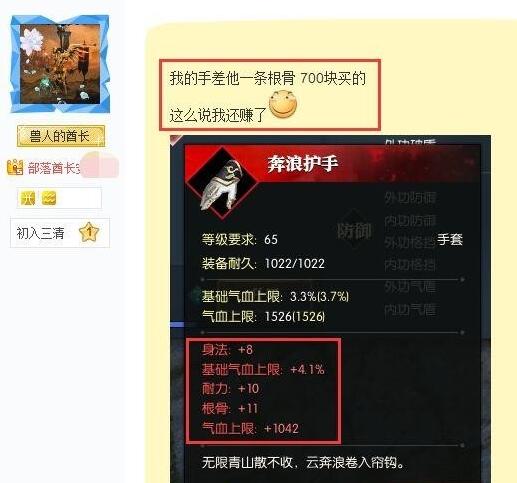 也有网友表示,自己的护手只花了700块,但和王校长的护手只差了一条属性,比起来赚了。不过评论里,玩家回复到,对于普通玩家来说这个装备的确赚了,但是对于真正追求极致的土豪来说,2万块去追求一件极品装备花费上万完全可以理解。