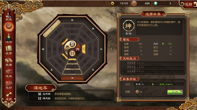 还有,游戏采取“八卦”判定机制而出现的分支方式。游戏中独创“八卦”配点,八卦的构成会影响到各方面的基本能力,不同配点的玩家,会发现因为特定数值不足而错过另一个发展,或是得到出奇不意的发展。
