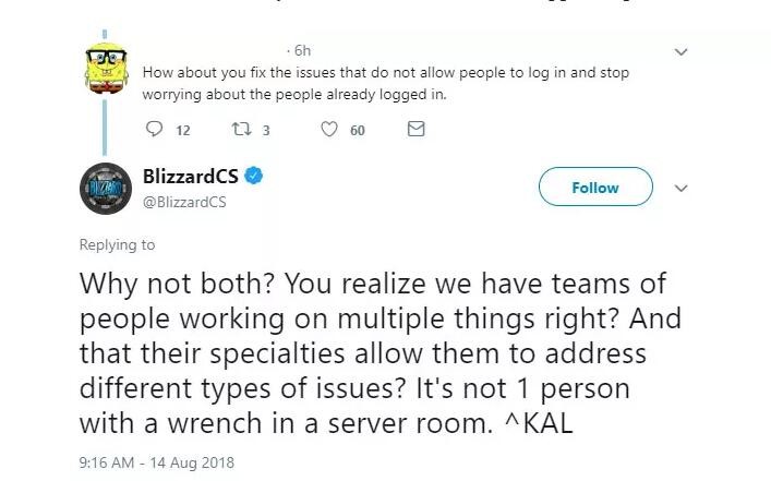 近日,暴雪北美客服官推发送了一条关于《魔兽争霸》中新神器艾泽拉斯之心无法获得的BUG反馈公告之后,有玩家就评论道:“你们怎么不修复一下无法登陆的BUG呢?比起已经进游戏玩的人,还是先管管不能登录的吧!”