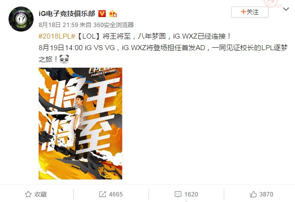 根据iG电子竞技俱乐部官方微博,王思聪将在今天下午2点IG对阵VG的比赛中登场,担任首发ADC。