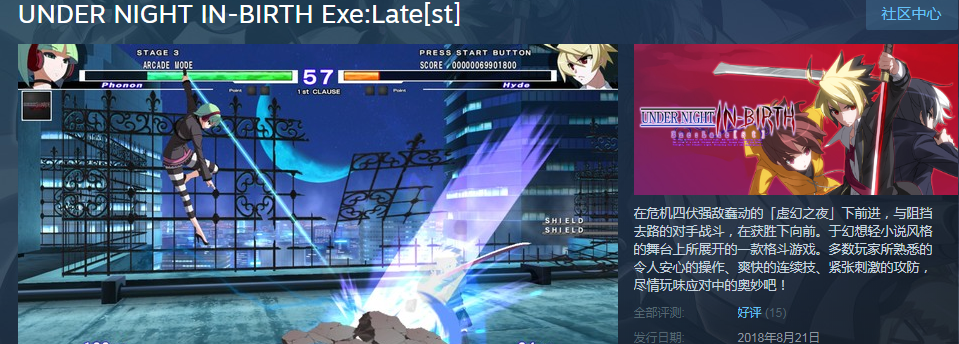 Arc System Works宣布,日式格斗游戏《夜下降生Exe:Late[st]》Steam版今天正式解锁发售。这是一款经典日式格斗游戏的最新加强版。