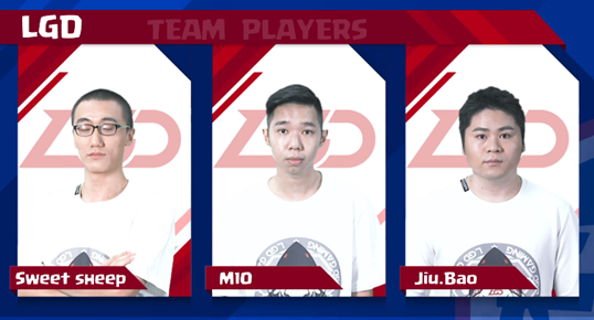 LGD的首发阵容为Sweet sheep,M1O、Jiu.Bao。