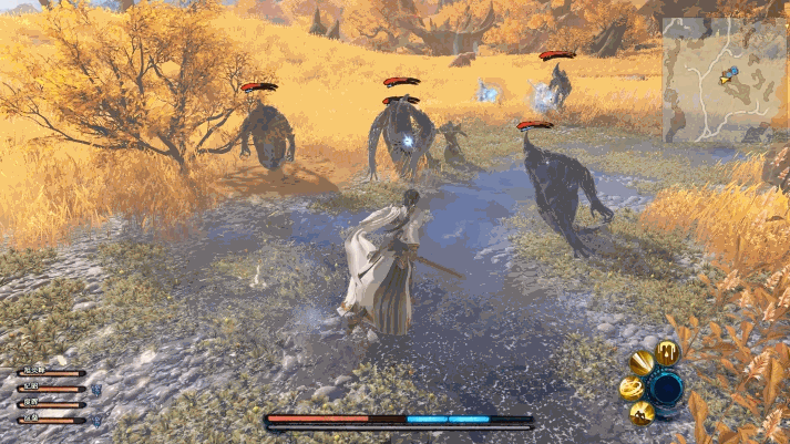 幽隐:幽隐会隐身,藏匿于浓雾中,但元精不高。对付它时需要注意画面中的预警提示,及时用闪避躲开它的冲刺攻击,然后再抓住空隙持续攻击它即可。