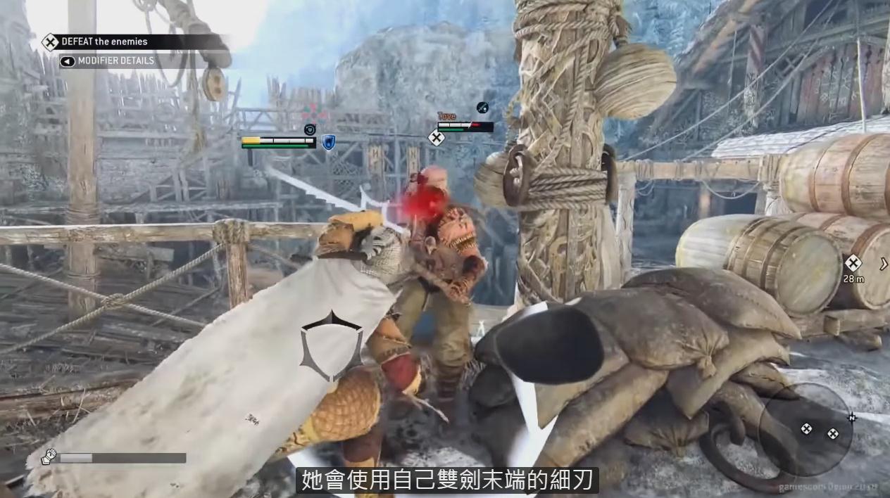 育碧日前发布了《荣耀战魂》官方中文预告,让玩家更好理解游戏新特色,预告介绍了全新武林英雄女侠和将军,女侠是致命刺客,她挥舞着双钩剑,女侠跟以往刺客不同,可以施展范围较远的攻击,这是所有英雄中最炫酷的范围攻击。女侠最厉害的地方在双钩可以将敌人的武器拉掉。另一名英雄“将军”攻击比较井然有序,很擅长挥舞关刀,他的所有攻击都是范围攻击,不过非常消耗体力。