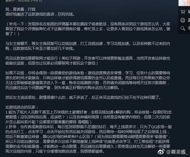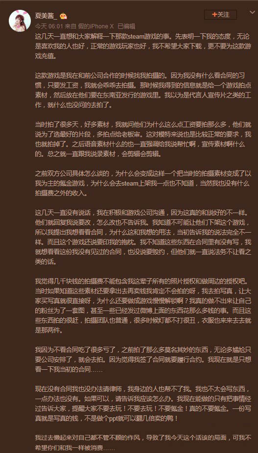 今日《女神驾到》女主角夏美酱发博表示,希望大家不要下载此游戏,更不要充钱,因为签合同时她没有看,以为只是普通的拍摄工作,并不知道这是一个游戏,也不知道它会在Steam上架。希望大家不要去玩。