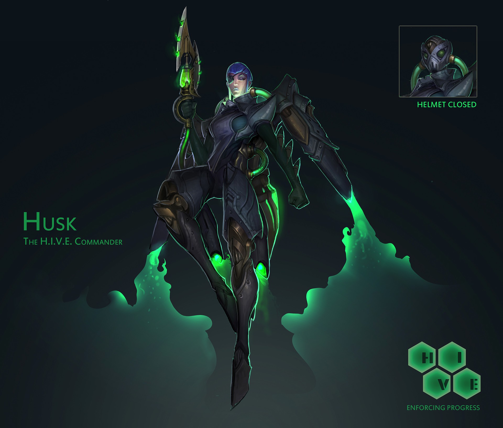 在原本的设计中,Husk此前曾是皮城女警凯特琳的搭档,后来叛逃至祖安,领导着一支名为“H.I.V.E”的雇佣兵团队,该团队由不法分子和赏金猎人组成。