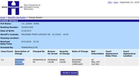 此前《侨报》记者查询到,在2018021695的序号中,显示出“LIU,QIANG DONG”,并被明尼苏达警方指控为“犯罪性行为(Criminal Sexual Conduct),并标注被已经被释放(Released From Custody)。但在保释金信息上标注为零在指控状态一栏中,标注为“已释放,有待起诉(RELEASED PENDING COMPLAINT)”。