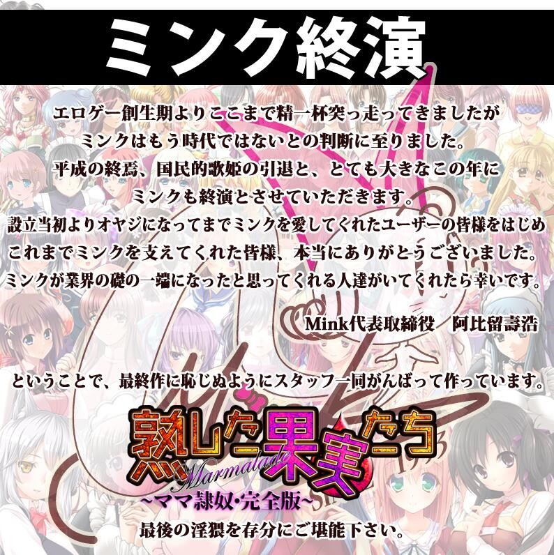 Mink在声明中表示,从XX游戏创生期至今一直在努力的做游戏,但现在已经不是Mink的时代了。平成时代终焉,国民歌姬引退,2018年是一个非常重要的年份,Mink 也在今年终演。感谢从Mink创立开始到现在,已经变成大叔的玩家们对于Mink的支持和喜爱,Mink的工作人员们会一同努力,做好Mink的最后一部游戏。