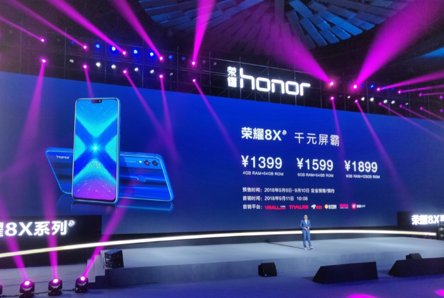 荣耀8X于9月6日—9月10日预售,9月11日10点08开售。手机4GB+64GB售价1399元,6GB+64GB售价1599元,6GB+128GB售价1899元,将于9月6日–9月10日预售,9月11日10:08开启首销。