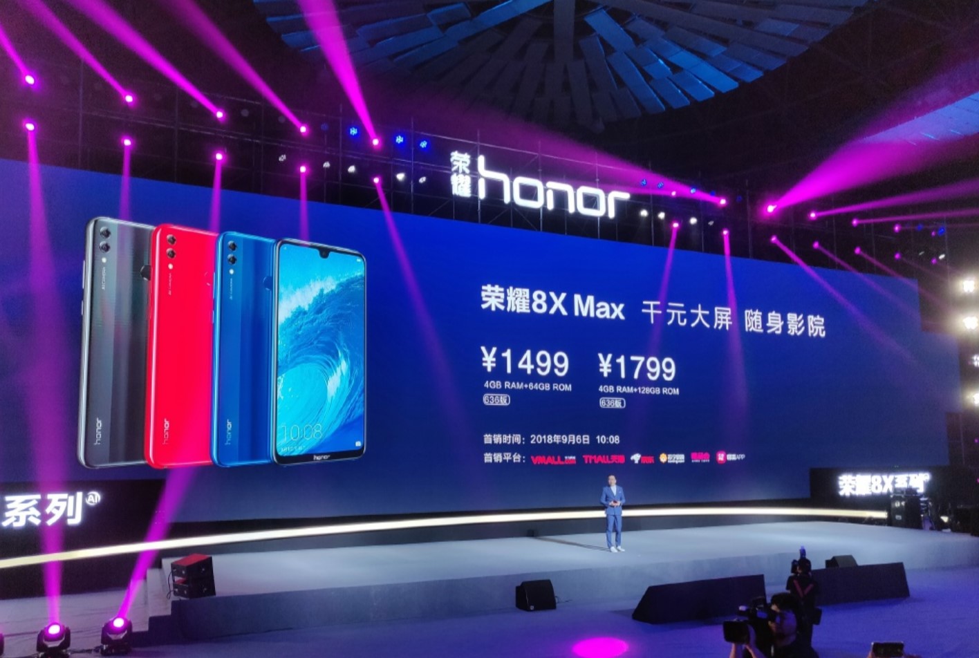 荣耀8X Max手机4GB+64GB售价为1499元 ,4GB+128GB售价为1799元 ,将于2018年9月6日10:08开始首销。
