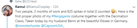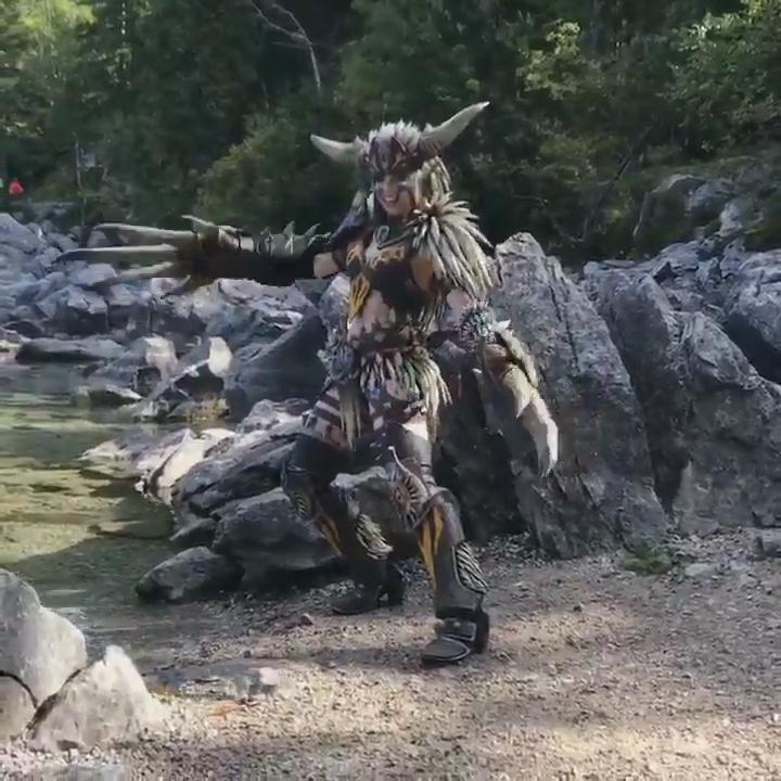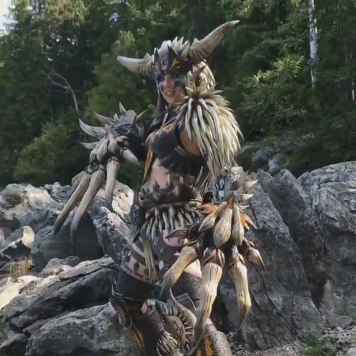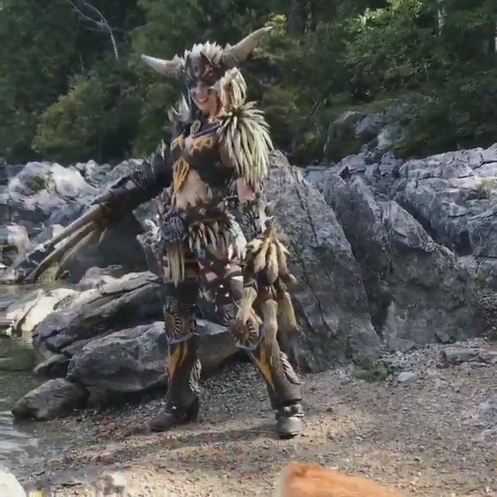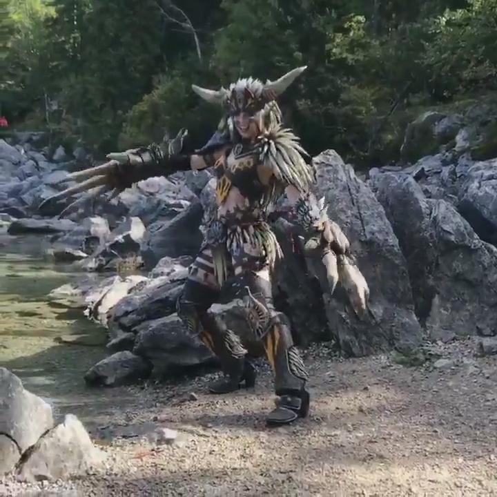 大神Kamui推特:2个人,3个月的劳作,总共825块尖刺(我数了)。这是首张我的灭尽龙套装和残灭之爪的正式照。今天由我的丈夫Benni在美丽的德国艾比湖拍摄。