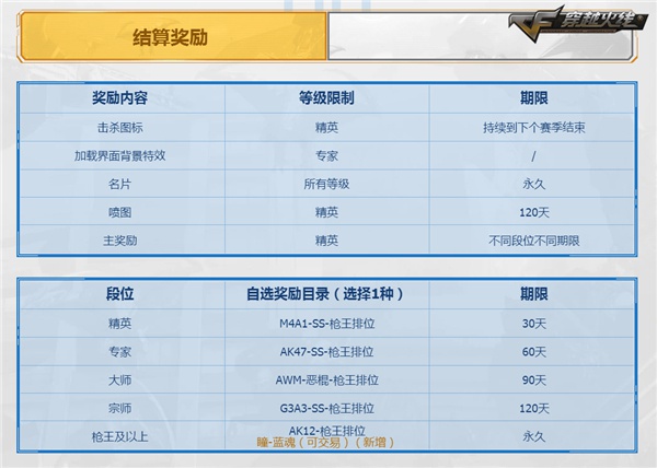 本次版本更新后,将对枪王排位第八赛季中各段位的小伙伴进行奖励结算,向符合条件的小伙伴们发放专属名片、喷图、击杀图标、加载界面背景特效与一项包含众多枪械道具在内的自选奖励。而新增的瞳-蓝魂则是瞳-灵魂武者的独有皮肤,拥有瞳的玩家可以使用此道具改变瞳灵魂武者的外观。