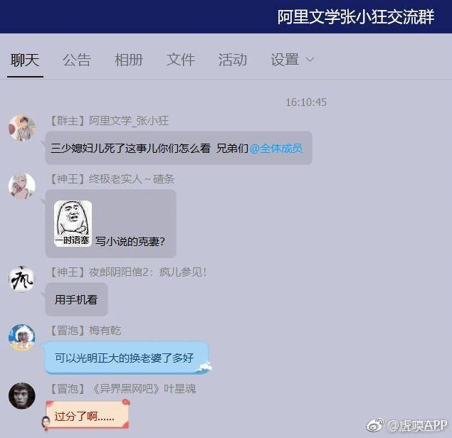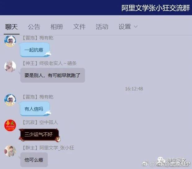 除此之外,今天唐家三少在微博要求阿里文学道歉,阿里文学的某编辑作者在某聊天群里发表了侮辱唐家三少亡妻的言论,唐家三少称,