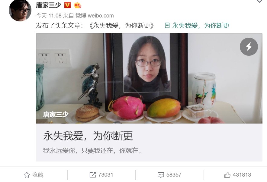 9月11日深夜,知名作家唐家三少发布微博消息:“我的木子走了。”,宣布了妻子李默过世的消息。今天唐家三少发文《永失我爱,为你断更》,在文章中表达了对亡妻木子的思念和悲痛之情。