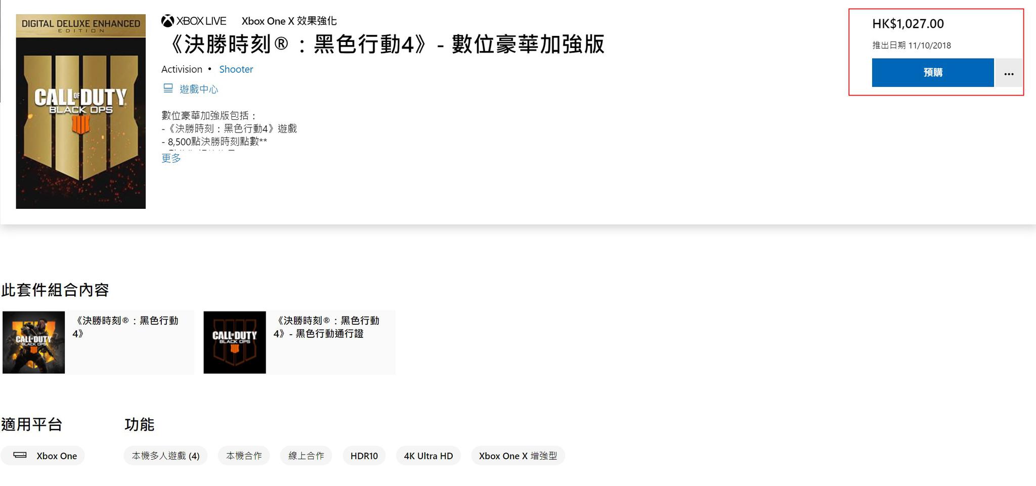 即将在10月12日发售的FPS游戏《使命召唤15:黑色行动4》也不例外。本作Xbox Live港服商城标准版售价474.5港币,约合RMB 415元。与此同时还有一个数字豪华加强版,售价高达1027港币,约合RMB 899元,将近900元,是本体游戏的两倍还多。
